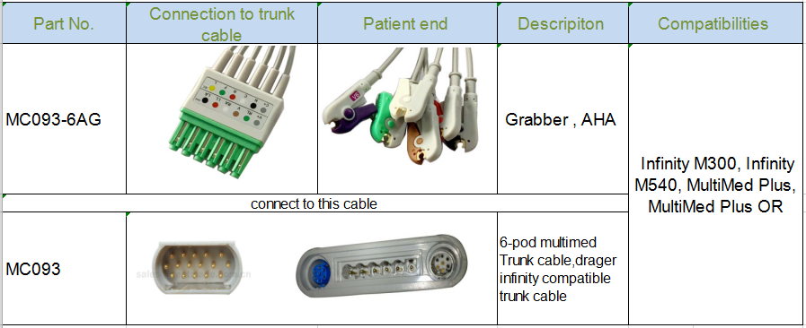Naši proizvodi uključuju sljedeće (1). Spo2 senzor za višekratnu upotrebu i jednokratnu upotrebu, spo2 kabel za adapter (2). Pacijent prati EKG kabel i ožične žice (3). Elektrokardiografski kabeli i vodiči. (4). Manžetna za krvni tlak za višekratnu uporabu / za jednokratnu upotrebu (NIBP). infuzorska vrećica. (5). sonda za praćenje temperature TEMP temperature (6). Pacijent prati IBP kabel i IBP pretvarač (7). Olovka ESU (8). Kružni plastični / metalni konektor sa samo-zaključavanjem.